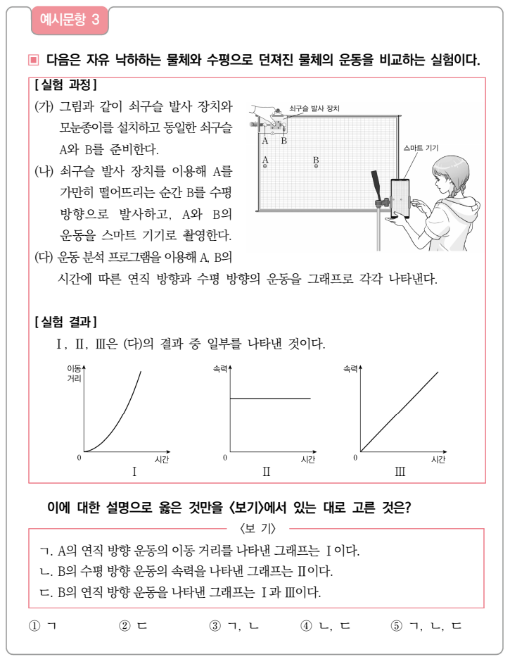- 과학 탐구 과정 및 자료 해석 능력 평가: 실험 설계, 데이터 수집 및 변환(표, 그래프 등), 자료 분석을 통한 경향성 및 규칙성 파악, 결론 도출 등 과학적 탐구 과정 전반에 대한 이해와 수행 능력을 중요하게 평가합니다. (예: 예시문항 3번 - 운동 분석, 예시문항 7번 - 온실 효과 실험)