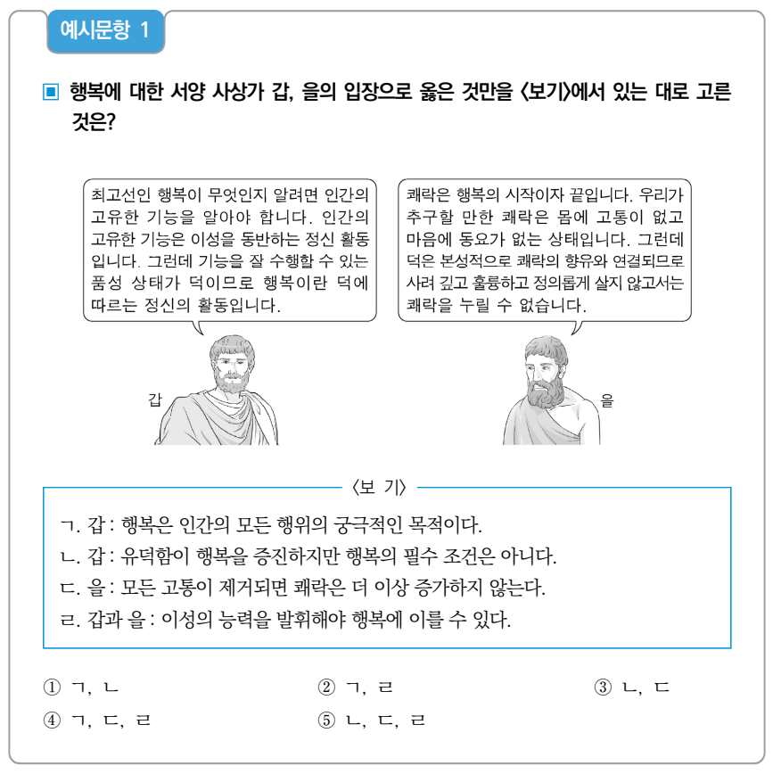 분석: 특정 사상가(아리스토텔레스, 롤스 등)나 사회 제도(사회 복지 등)의 핵심 개념을 정확히 이해하고 있는지를 묻습니다. 제시문의 내용을 바탕으로 해당 개념의 특징, 주장, 적용 사례 등을 파악해야 합니다.