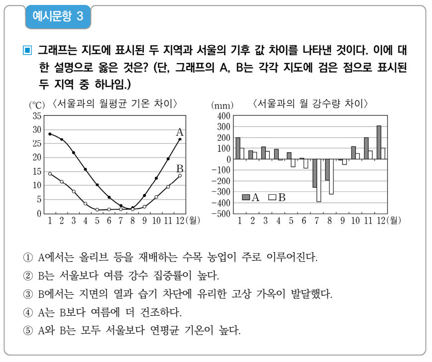 - 다양한 자료 해석 능력 강조: 지도, 그래프, 도표, 글 자료 등 다양한 형태의 자료를 정확하게 분석하고 해석하여 문제 해결에 필요한 정보를 추출하는 능력이 중요하게 평가됩니다. (예: 예시문항 3번 - 기후 그래프, 예시문항 5번 - 도시화 통계)