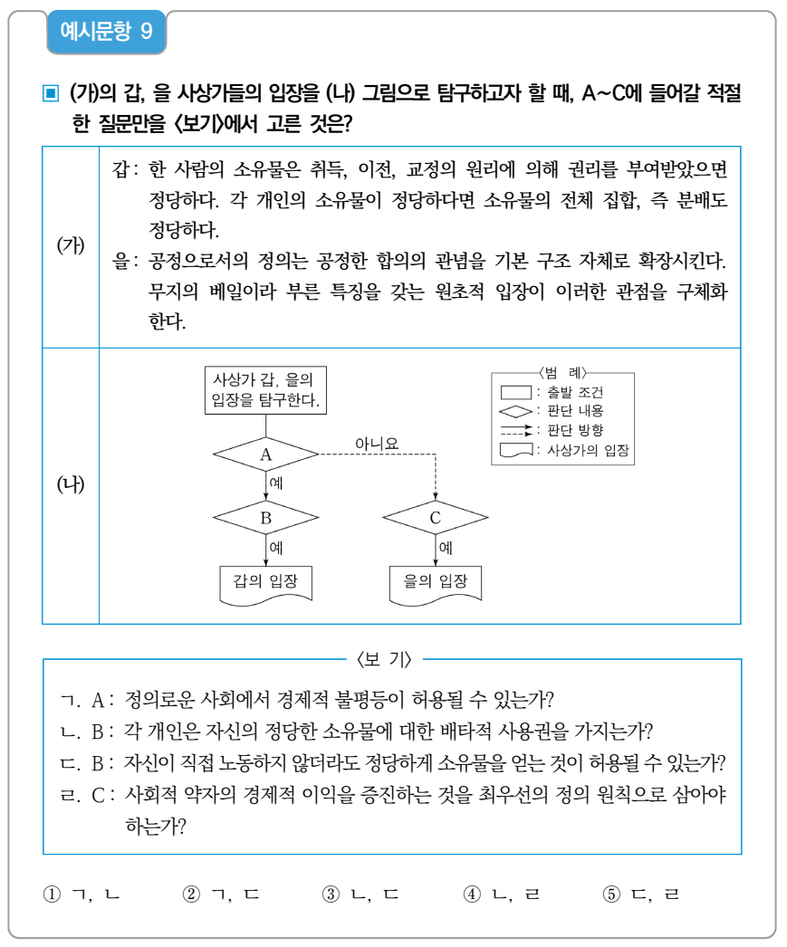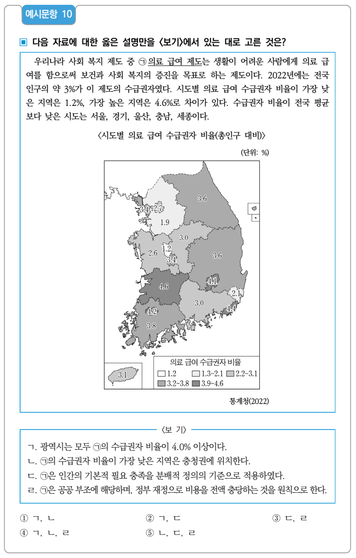 - 통합적 사고 및 적용 능력 중시: 단순히 개별 지식을 묻는 것을 넘어, 여러 영역의 개념(예: 지리+윤리, 경제+법)을 연결하거나, 학습한 개념을 구체적인 사회 현상이나 문제 상황에 적용하여 해결 방안을 모색하는 통합적 사고력을 요구하는 문항들이 포함되었습니다. (예: 예시문항 2번 - 자연관+평화, 예시문항 7번 - 헌법+시장경제)