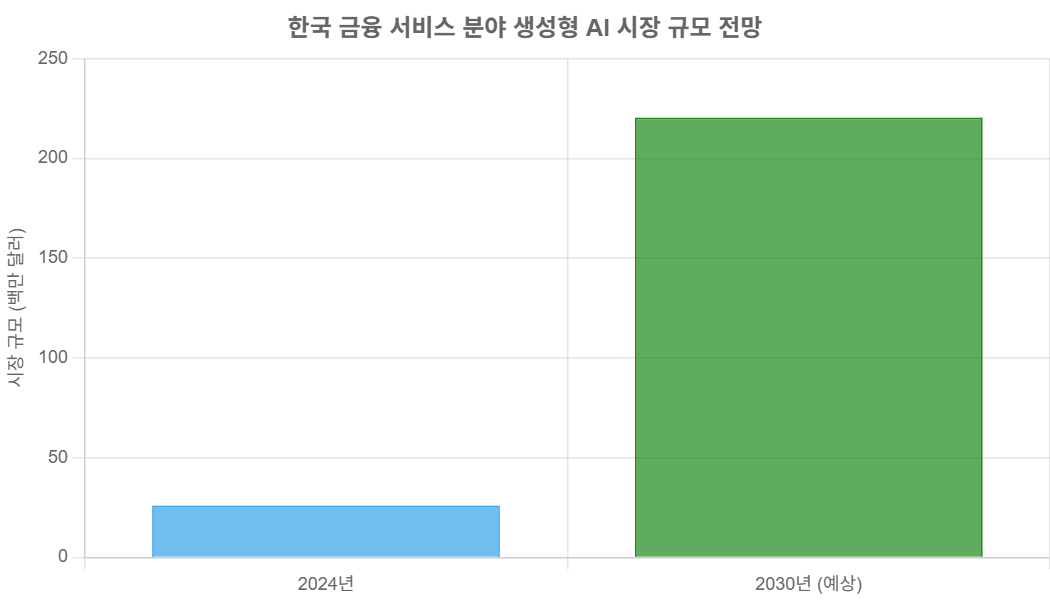 금융 분야에서도 AI 도입이 활발합니다. 특히 생성형 AI 기술은 사기 거래 탐지, 신용 평가, 고객 응대 챗봇, 개인 맞춤형 자산 관리 등 다양한 영역에서 활용되며 금융 서비스의 효율성과 보안을 높이고 있습니다. 한 시장 조사 보고서에 따르면, 한국의 금융 서비스 분야 생성형 AI 시장은 2024년 2,590만 달러에서 2030년 2억 2,040만 달러 규모로 연평균 43.9%의 폭발적인 성장이 예상됩니다.