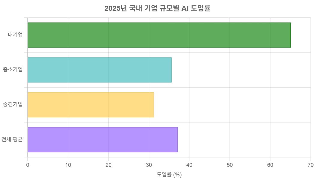 이러한 글로벌 AI 트렌드는 한국의 산업 현장을 어떻게 바꾸고 있을까요? 국내 기업들은 AI를 적극적으로 도입하며 경쟁력을 높이고 있습니다. 한 조사에 따르면, 국내 기업 10곳 중 4곳(37.1%)이 이미 AI를 업무에 활용하고 있으며, 특히 대기업의 도입률은 65.1%에 달했습니다.