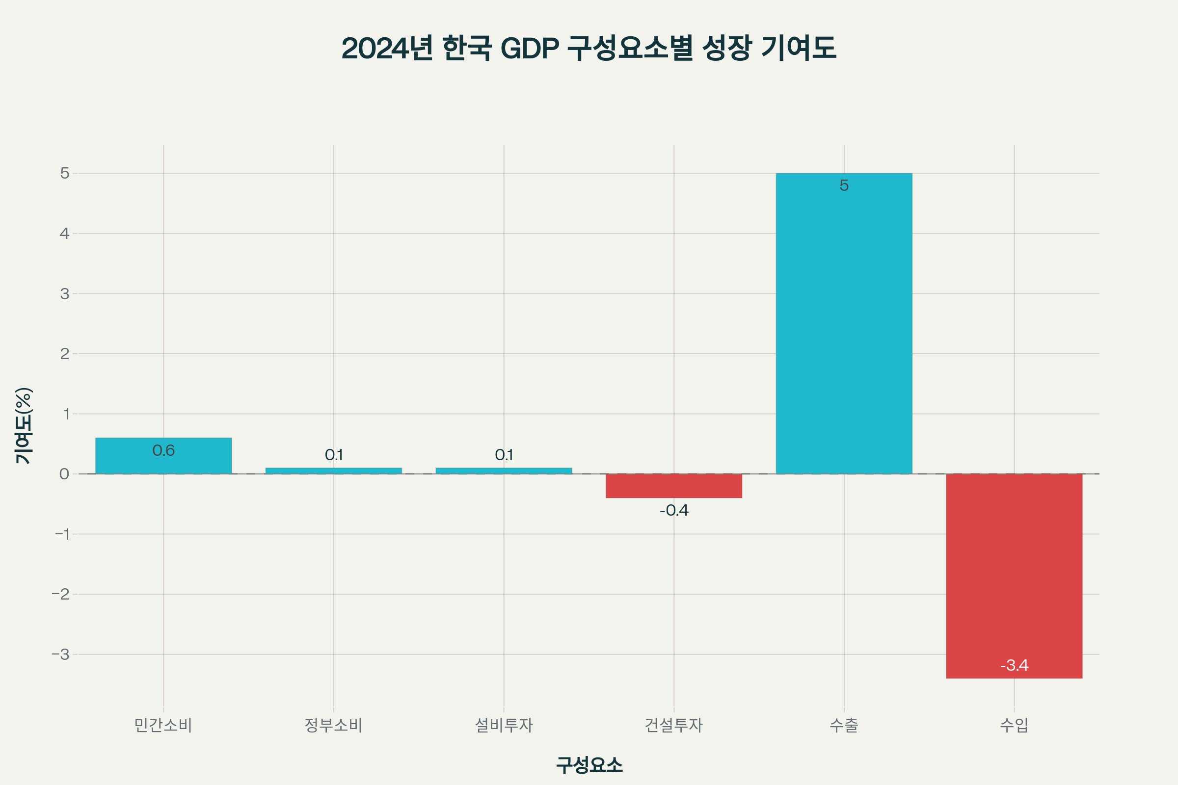 수출로 먹고사는 우리나라에게 가장 중요한 엔진입니다. 위 그래프에서 보듯 2024년 성장은 사실상 수출이 전부 이끌었다고 해도 과언이 아닙니다. 하지만 상위 3개 품목(반도체, 자동차 등)이 전체 수출의 약 40%를 차지할 정도로 특정 산업에 대한 의존도가 높아, 글로벌 경기에 따라 경제 전체가 흔들릴 수 있는 구조적 과제를 안고 있습니다.