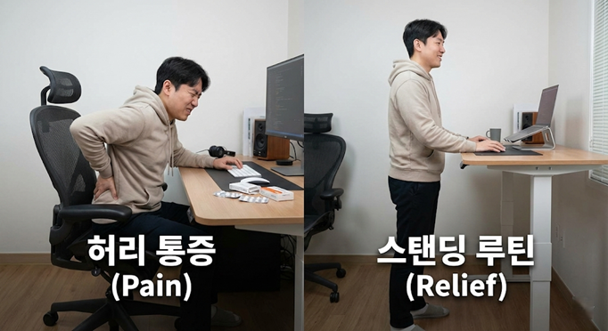 - 스탠딩 책상 활용법: 점심 식사 후 30분, 혹은 나른한 오후 3시에 20분 정도만 서서 일하세요. 잠도 깨고 허리 압력도 줄여주는 최고의 활용법입니다.