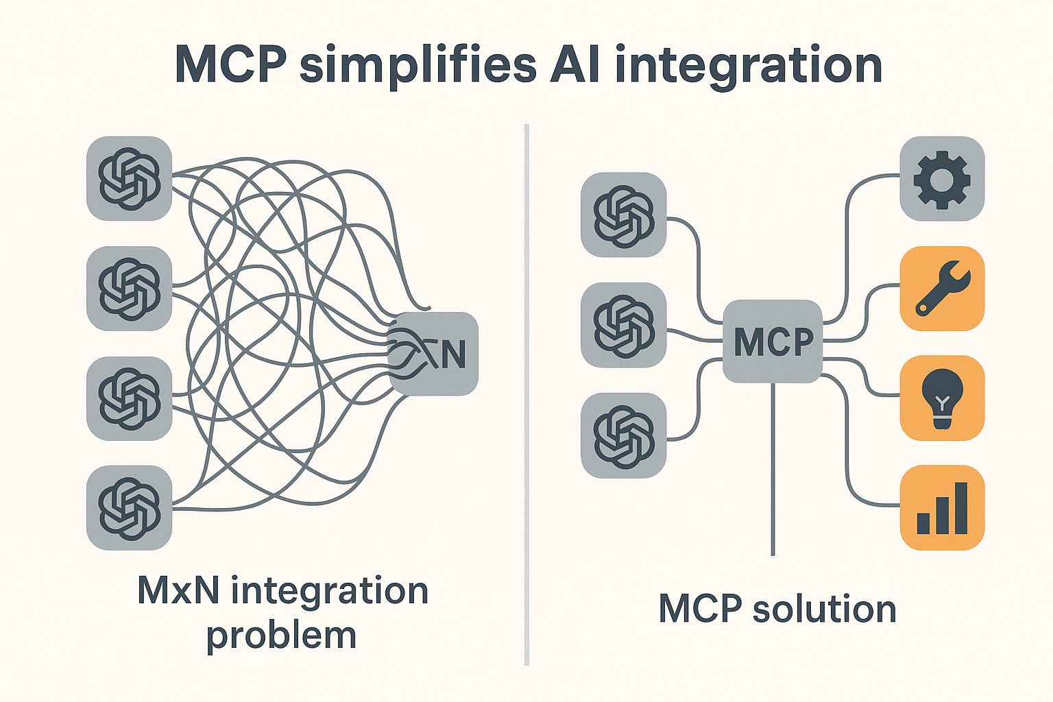 기존에는 AI 모델마다, 연결하려는 도구마다 각각 다른 방식으로 연결 코드를 만들어야 해서 복잡하고 비효율적이었어요. 마치 M개의 AI 모델과 N개의 도구를 연결하려면 M x N 만큼의 연결 작업이 필요한 'MxN 통합 문제'가 있었던 거죠. MCP는 이 복잡한 문제를 마치 USB-C 포트처럼 하나의 표준 연결 방식으로 통일해서, 개발자들이 훨씬 쉽고 빠르게 AI 애플리케이션을 만들 수 있도록 돕는답니다.