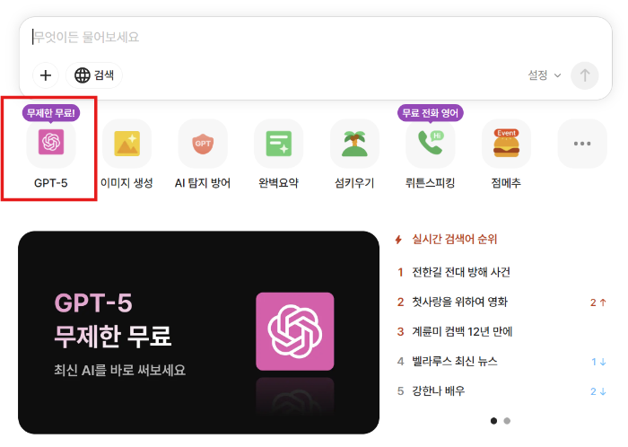 - GPT-5 모델 선택: 메인 화면 선택 메뉴에서 'GPT-5'를 클릭합니다.